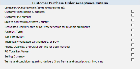 To overcome processing inaccuracies, as well as improve our processing cycle time and service for our customers, we will be implementing the Customer PO Acceptance Criteria. As a part of that criteria, all the details below should be complete and accurate.